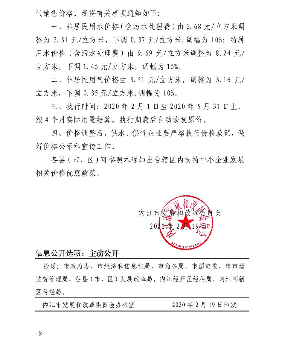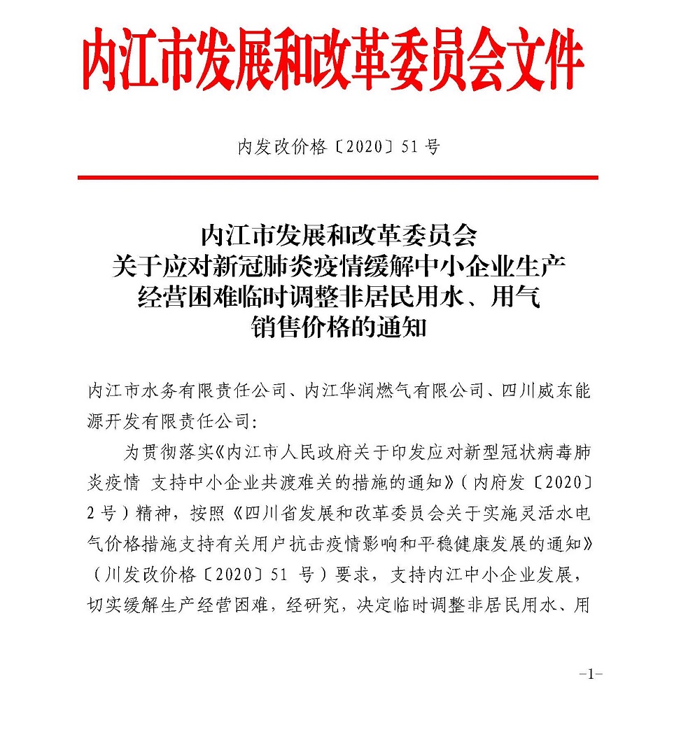 內(nèi)江市發(fā)展和改革委員會關(guān)于應(yīng)對新冠肺炎疫情緩解中小企業(yè)生產(chǎn)經(jīng)營困難臨時(shí)調(diào)整非居民用水、用氣銷售價(jià)格的通知