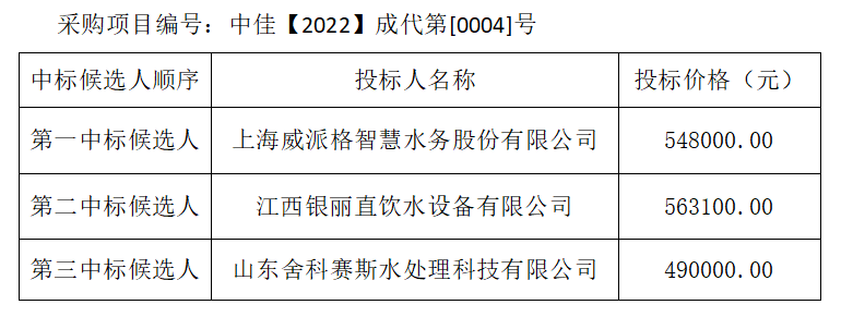 內(nèi)江市水務(wù)有限責(zé)任公司東湖御景小區(qū)集中式管道直飲水成套設(shè)備及附件采購(含安裝)項目評標(biāo)結(jié)果公示