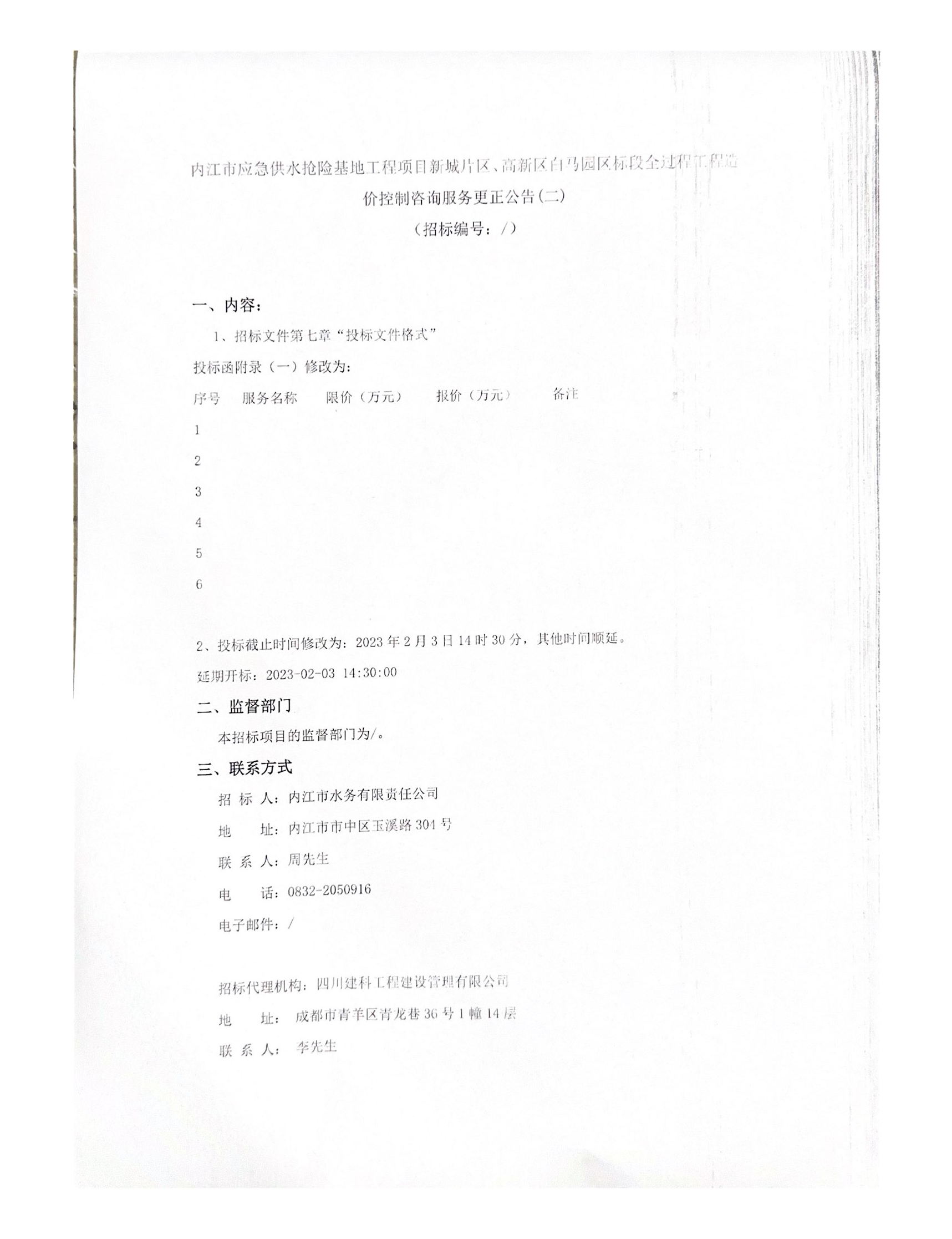 內(nèi)江市應(yīng)急供水搶險基地工程項目新城片區(qū)、高新區(qū)白馬園區(qū)標(biāo)段全過程工程造價控制咨詢服務(wù)更正公告(二)