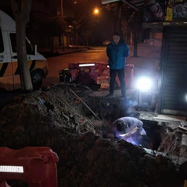 2月2日晚8點40分,接到市民報漏電話,位于晏家灣車站外的供水主管爆裂,部門立即組織人員趕往現(xiàn)場。經(jīng)查看確認為一根DN150供水主管破裂,為了保障居民的正常用水,搶修人員連夜冒雨對供水管道進行搶修,經(jīng)過5個小時的搶險作業(yè),于次日凌晨1點完成搶修任務(wù),保障了該區(qū)域居民正常用水。