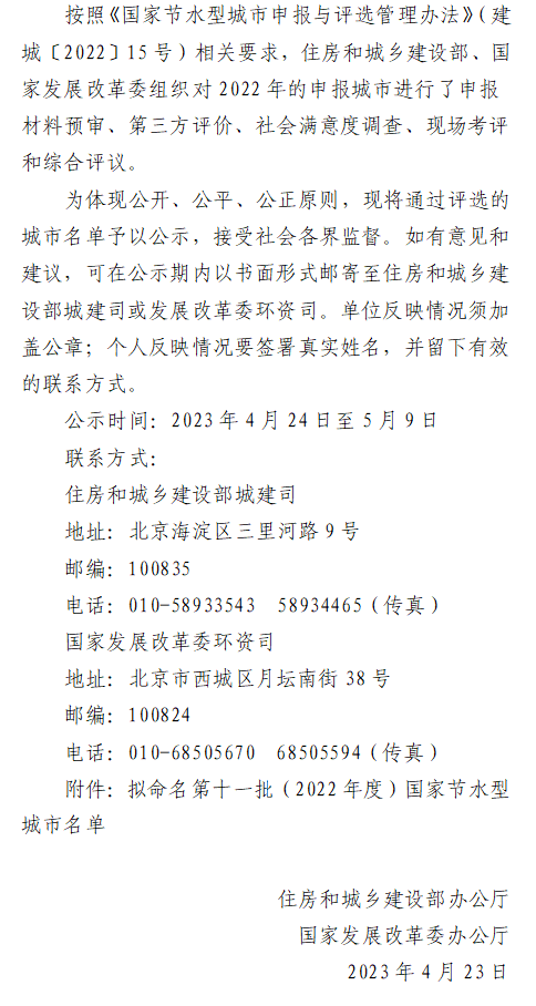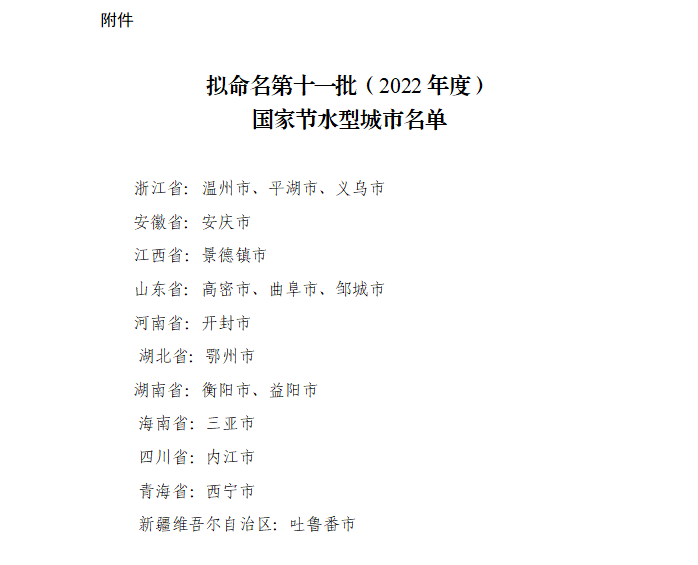 關(guān)于擬命名第十一批(2022年度) 國(guó)家節(jié)水型城市的公示