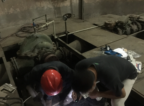 為節(jié)約生產(chǎn)成本,鍛煉員工操作技能,由二水廠員工負(fù)責(zé)對(duì)電機(jī)基礎(chǔ)加工改造及后續(xù)校正安裝等工作。進(jìn)入7月持續(xù)酷暑,受上游強(qiáng)降雨影響,沱江原水濁度上漲,二水廠在處置高濁水的間隙,趕往城區(qū)水廠對(duì)1#電機(jī)基礎(chǔ)的鋼板進(jìn)行焊接。深井泵房噪音大、空氣流通性差、溫度高,但維修人員不畏艱辛,身穿防護(hù)服,花費(fèi)數(shù)天時(shí)間終于完成了電機(jī)基礎(chǔ)改造工作。